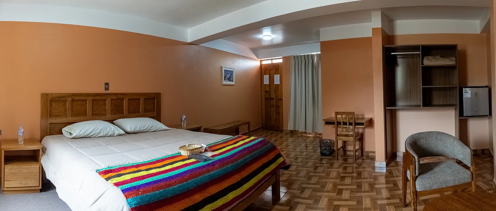 Un espacio exclusivo y elegante, diseñado para quienes buscan una estadía especial y confortable en Huaraz. Equipada con 1 cama King, sala de estar y frigobar, esta suite ofrece el lugar ideal para relajarte. Desde tu terraza privada podrás contemplar las impresionantes vistas de la Cordillera Blanca, mientras disfrutas de la tranquilidad y privacidad que mereces, cada detalle de la suite, desde la decoración hasta el ambiente acogedor, está pensado para brindarte comodidad, elegancia y una experiencia única.